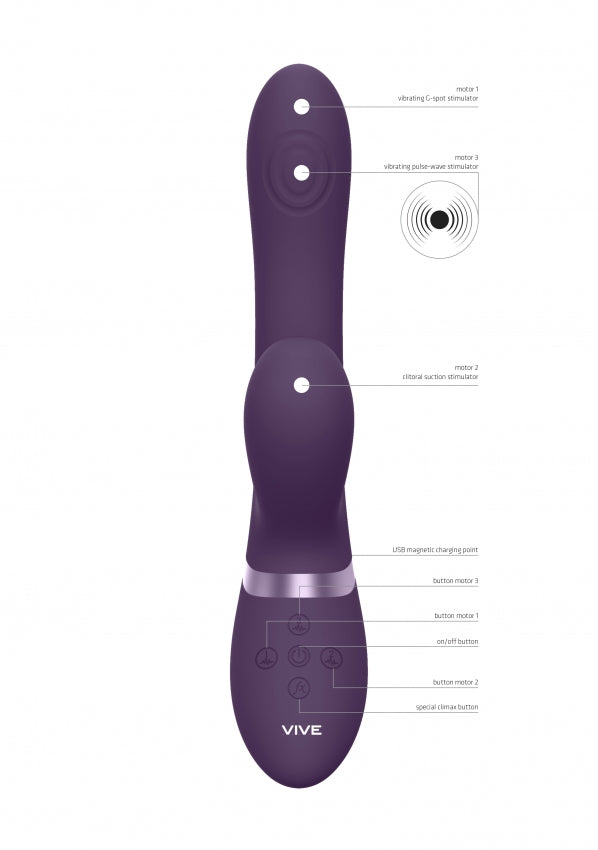 It contains a USB magnetic rechargeable lithium-ion battery. When fully charged with its USB cable, it will provide 40 minutes of passionate playtime. Just plug, charge and play! When you're getting Close to climax, just one-touch of the special function climax button will immediately bring all the motors to full power/speed and, more importantly, bring you to an earth-shattering orgasm. All VIVE Vibrators have a full 1-year warranty to protect your investment.