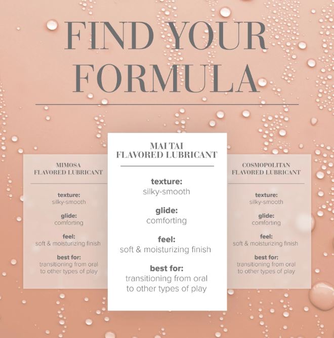 Adult fun meets adult flavors in our popular water-based Cocktail inspired flavored lubricants. Their sensual, comforting glide and silky-smooth feel are perfect for any intimate moment, particularly when transitioning from oral to other types of play. And when you’re done, it cleans off easily and leaves your skin feeling soft and moisturized. Available in Pina Colada, Sex on the Beach, and Mojito, as well as our newest additions to the line, Mimosa, Cosmopolitan, and Mai Tai.