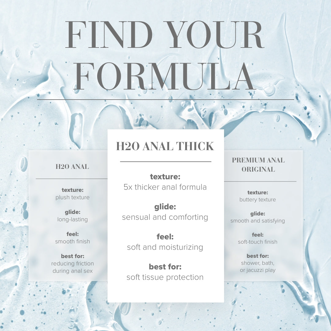 JO H20 Anal Thick isn't just kind of thick - it's FIVE TIMES thicker than our best-selling anal formula. Made for those looking for an extra cushiony experience without compromising glide, this water-based lubricant delivers a smooth feel and extra protection for soft tissue. Never sticky, H20 Anal Thick is made without parabens, fragrances, or desensitizers. What’s the difference between JO Thicker Anal and JO H2O Water-Based Anal? JO Anal Thick is made with our original water-based anal formula with five times the thickness. Designed specifically for those looking for extra cushion and a smooth feel, this extra thick formula provides soft tissue protection with a sensual, comforting glide. Are all JO lubricants toy and condom compatible? Condom compatibility varies and is specific to the lubricant formula. JO water-based and hybrid formulas are safe to use with most toys and condoms. JO silicone and oil formulas are safe to use with hard plastic, glass, metal, ceramic, and stone toys. They are not safe to use with silicone toys. For condom compatibility information for silicone and oil formulas, please review the specific product pages. Are JO lubricants vegan and gluten-free? JO does not use ingredients with animal byproduct in any of our products. The FDA does not currently classify personal lubricants as vegan, but JO meets the standards. JO does not use any gluten in our formulas; however, our products are manufactured in facilities that also manufacture products with gluten.Key Features