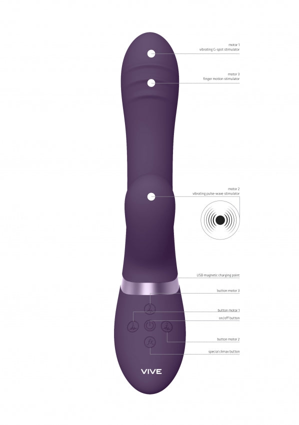 TANI It is one of the most Innovative and powerful vibrators on the market today thanks to its Three 10-funtion New Generation F1 motors and its advanced technologies (All Three Motors can be Independently Controlled). One 10-function NG F1 Vibrating Motor for your G-Spot, One Innovative 10-function NG F1 Finger Motion Motor that simulates a finger motion and One Innovative 10-function Pulse-Wave Motor for Clitoral stimulation, this vibrator has it all.With the unique 3 ridge vibrating design to stimulate your G-spot and pulse wave clitoral stimulation coupled with a finger motion motor gives you the possibility of 1,000 distinct setting, this vibe will leave you weak in the knees. Made from 100% silky smooth medical-grade silicone (hypoallergenic), it is totally waterproof (IPX7), and extremely quiet at under 60db. This means you can use it wherever your heart desires! It contains a USB magnetic rechargeable lithium-ion battery. When fully charged with its USB cable, it will provide 40 minutes of passionate playtime.Just plug, charge and play! When you're getting Close to climax, just one-touch of the special function climax button will immediately bring all the motors to full power/speed and, more importantly, bring you to an earth-shattering orgasm.